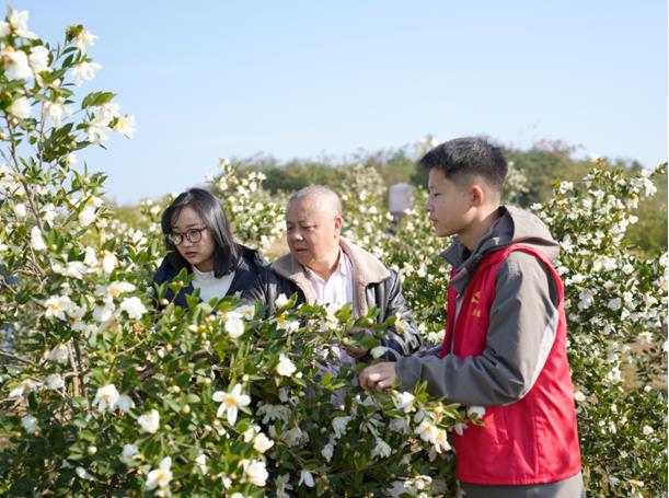 袁明凯&廖志讯 旷野芳菲尽,岭上茶花开。初冬时节,步入四川苍溪县歧坪镇红杨村油茶产业园,朵朵油茶花竞相绽放,星星点点如雪似玉。“天气晴好时候,一天有好几百人前来赏花、拍照打卡。”置身于雪白与翠绿交相辉映的茶树林间,红杨村党支部书记吴代永满脸欣慰。