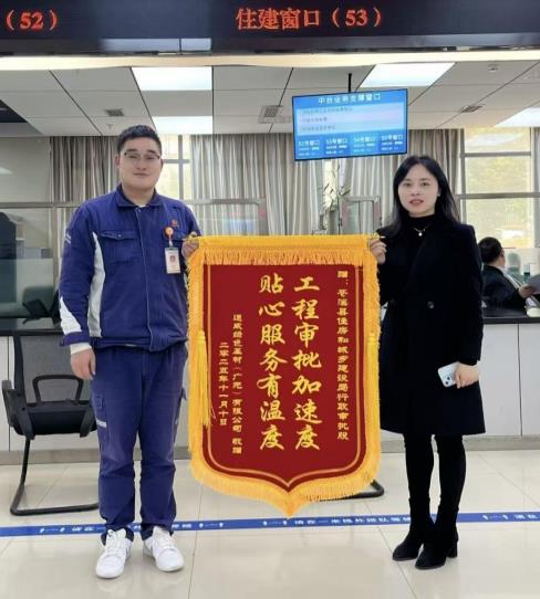 罗旭锋讯 11月17日,通威绿色基材(广元)有限公司负责人专程来到苍溪县政务服务中心,将一面印有“工程审批加速度,贴心服务有温度”字样的锦旗送至工作人员手中,对其在办理建设工程竣工验收备案过程中提供的便捷高效、“容缺”审批服务表示高度认可与诚挚感谢。
