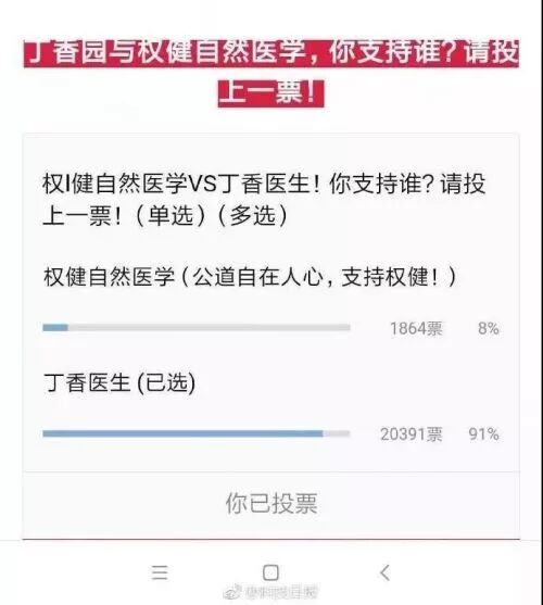 还发起了投票:丁香园与权健自然医学,你支持谁?请投上一票!