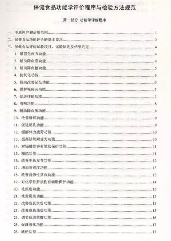 因此,在审查上,保健品需要做的只是跟食品一样进行色泽、气味、理化指标、污染物等指标的审查,但在宣传上,保健品却可以进行功能性宣传。从2003年起实施的《保健食品检验与评价技术规范》就详细列出了二十多种保健品功能及实验判定方法。