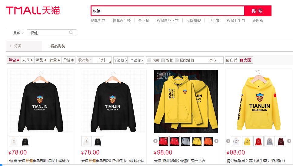 而在天猫上搜索“权健”,已无权健相关保健产品,仅剩“天津权健俱乐部训练服中超球衣”的搜索结果。